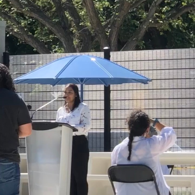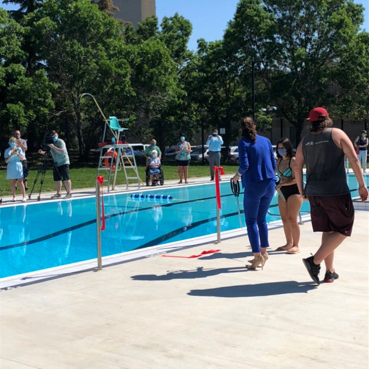 From left to right: HCA Executive Director Aria Ramdeo delivers a speech at the grand opening of Maple Leaf Pool; City of Regina Mayor Sandra Masters cuts the ribbon at the grand opening of Maple Leaf Pool; HCA Executive Director Aria Ramdeo and HCA Program Coordinator Wendy Miller stand in front of the newly re-opened Maple Leaf Pool.