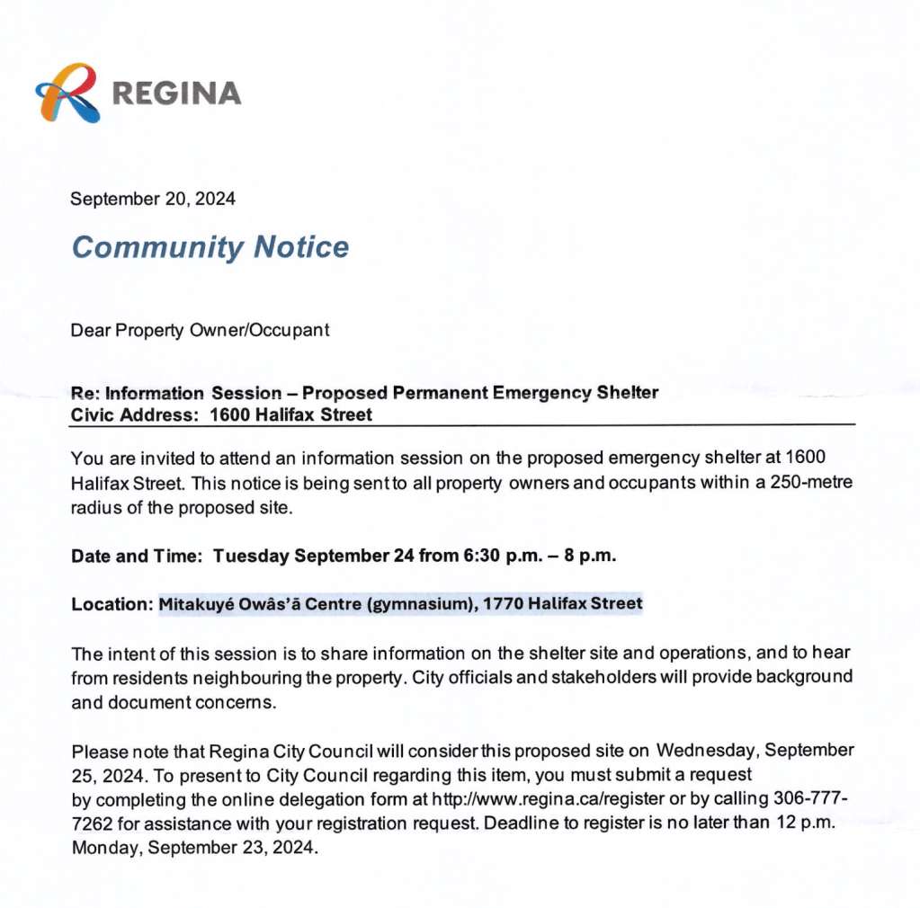 The City of Regina is inviting community members to attend an information session on the proposed emergency shelter at 1600 Halifax Street.